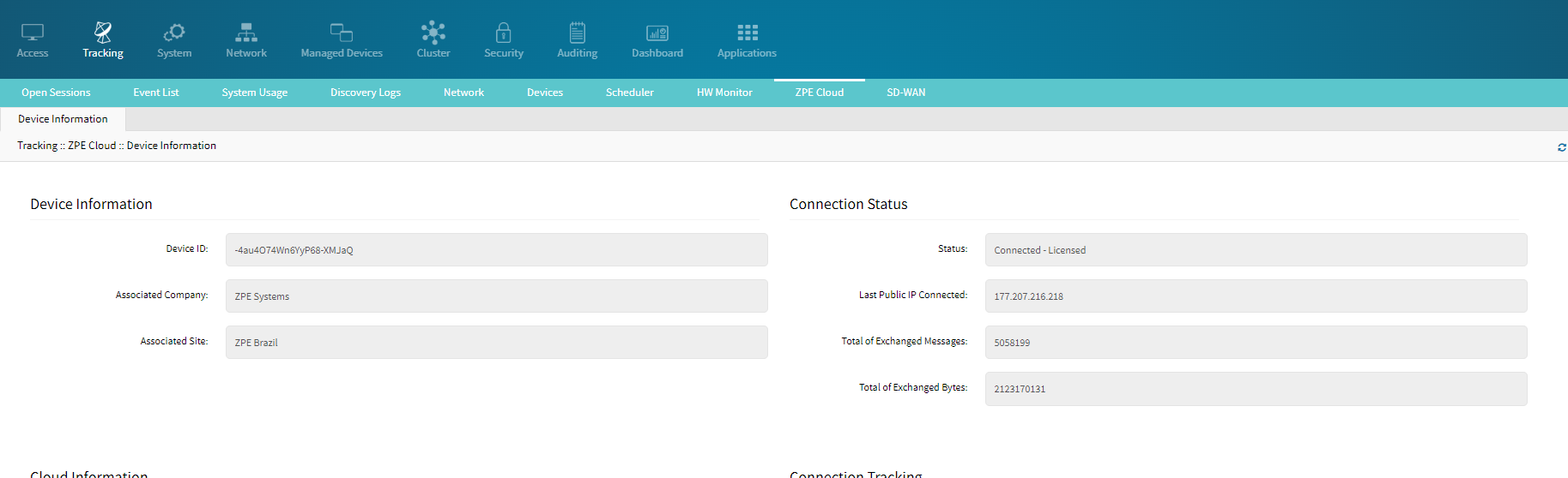 2. From device side, you can check the status in Tracking :: ZPE Cloud :: Device Information. Device is showing as Connected - Licensed