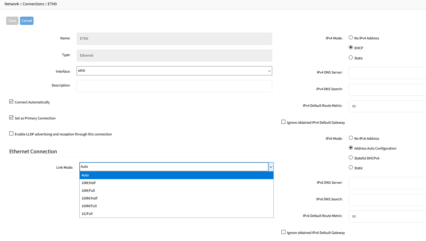 Nodegrid allows users to set the default connection speed for eth0 and eth1 under Network :: Connections :: ETH0/ETH1 via the Link Mode drop-down menu: