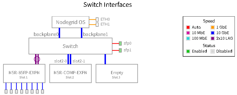 Under Network :: Switch :: Switch Interfaces, you can see the physical layout of Nodegrid OS interfaces and switch ports. The diagram below shows an example of an NSR device with an SFP slot (can be also an PoE or Ethernet), which becomes a switchable interface once the module is connected.
